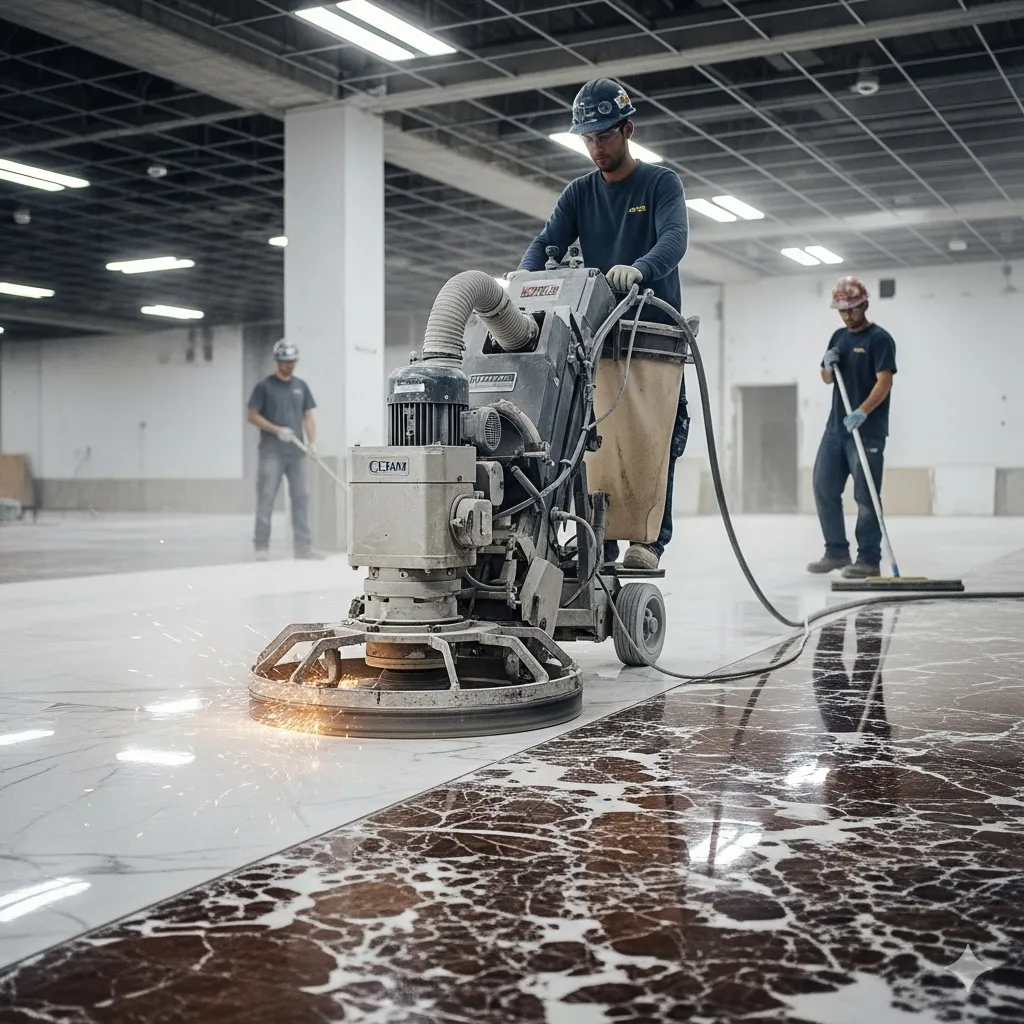Parlatma İşlemi → Silim sonrası mermerin doğal parlaklığı profesyonel ürünlerle ortaya çıkarılır.